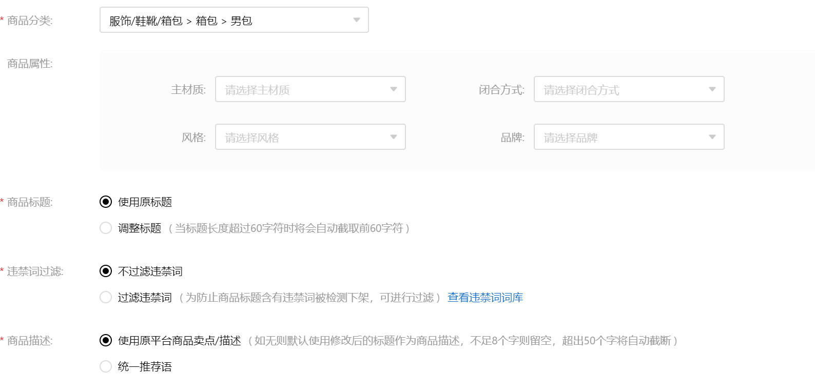商品標題(必填):可以選擇是否調整標題或者直接使用原標題,調整標題可以『刪除關鍵詞』、『增加關鍵詞』、增加標題前后綴。