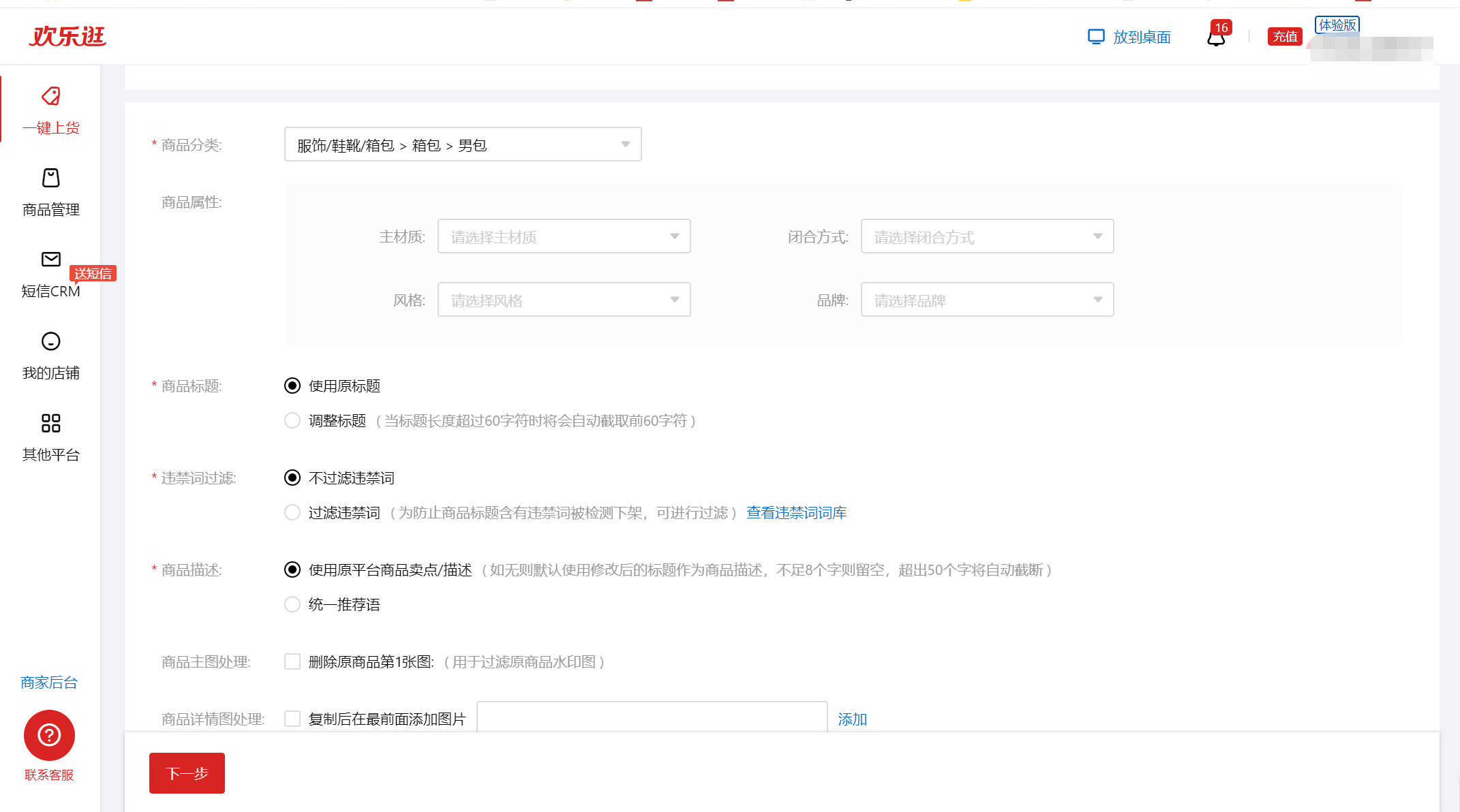 一、進入歡樂逛快手小店上貨助手,選擇一鍵上貨功能進行批量復制商品。
