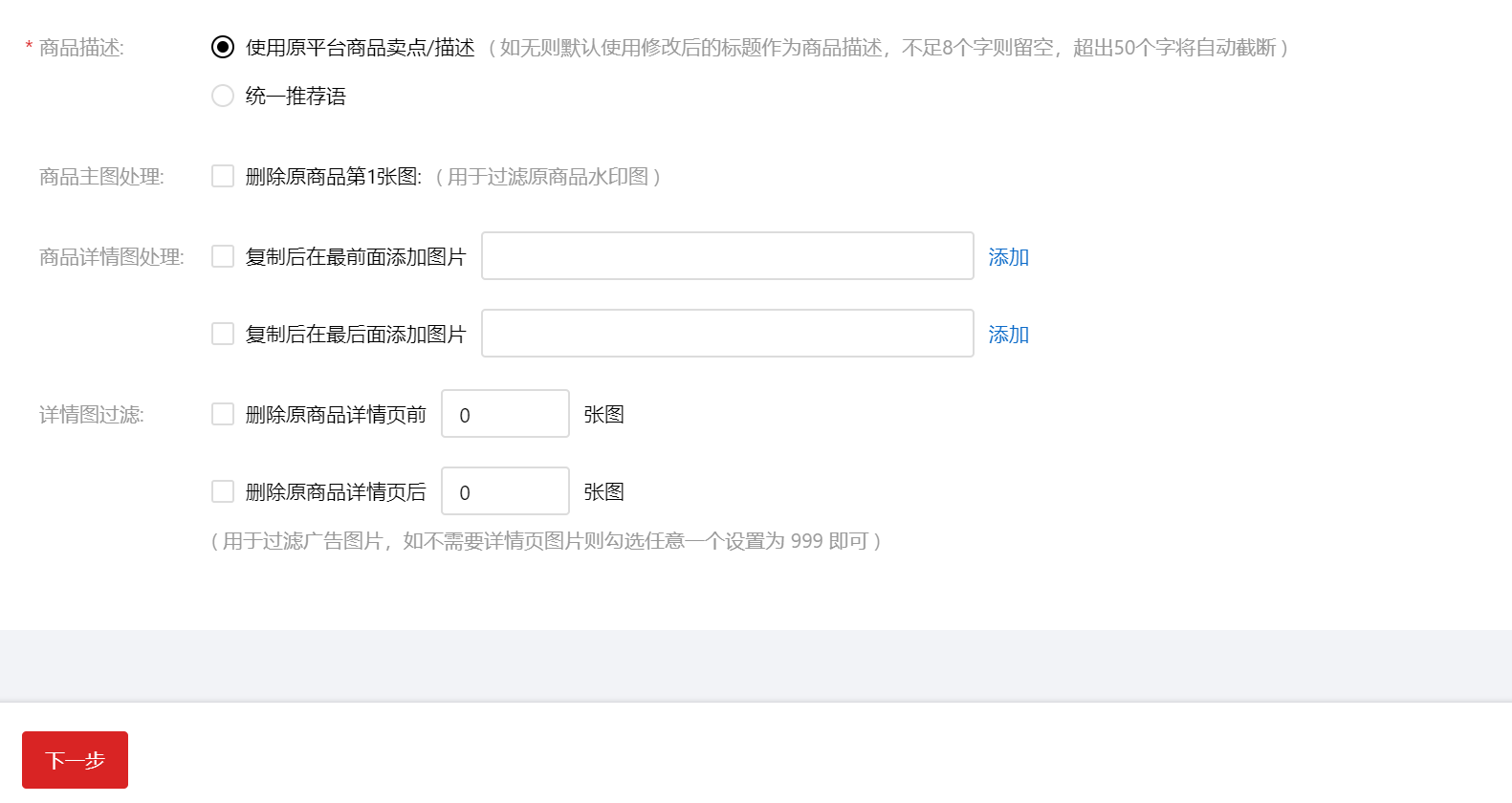 模板配置的內容:商品分類(必填)、商品標題(必填)、品牌(非必填)、推薦語(非必填)、商品重量(必填)、支付方式(必填)、商品主圖處理(非必填)、商品詳情圖處理(非必填)、詳情圖過濾(非必填)