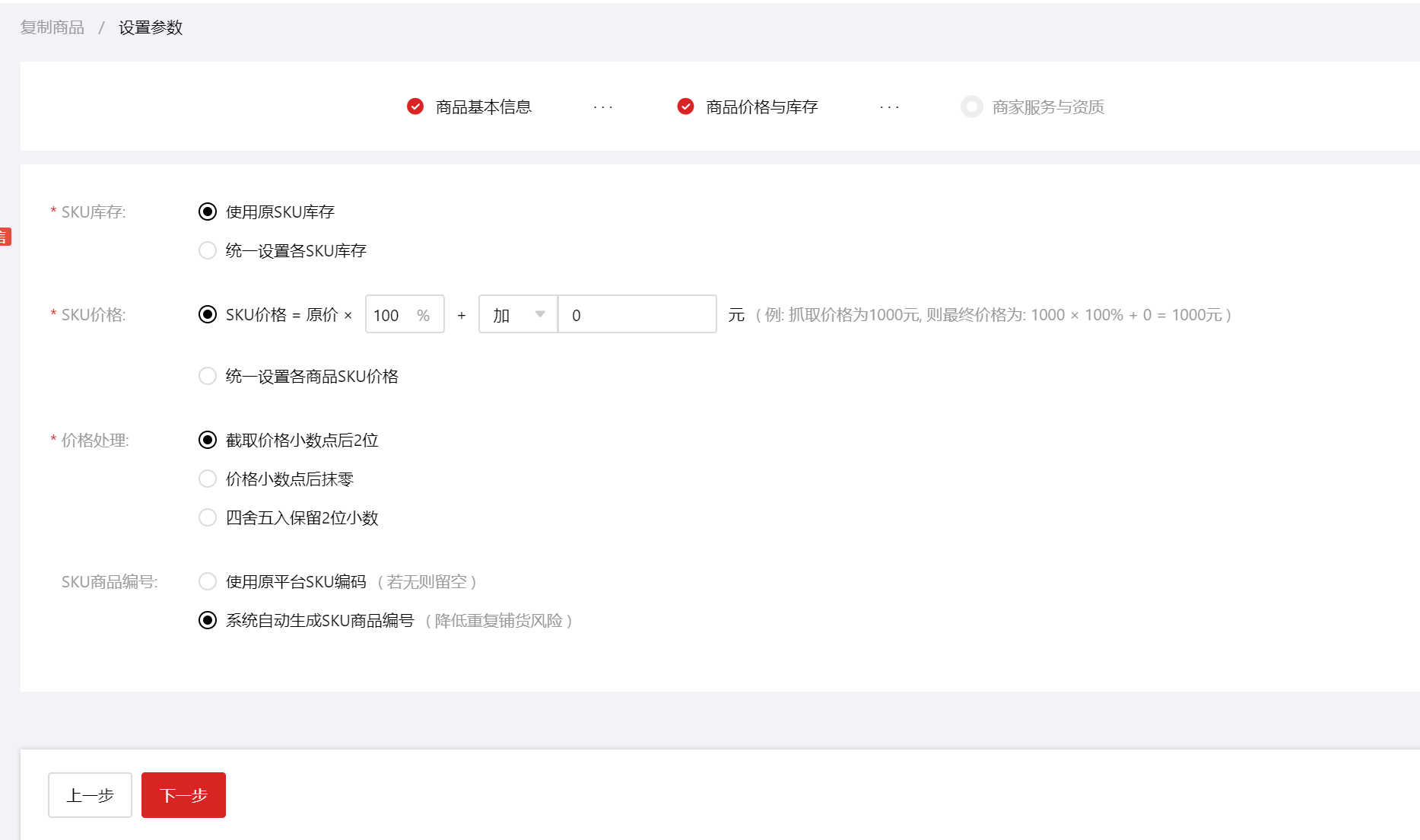 可以根據自身的需求,從原平臺復制到快手小店是需要設置價格與庫存,可以設置sku庫存、sku價格、各商品sku價格、可以設置價格小數點部分的處理方式、商品編碼等信息。
