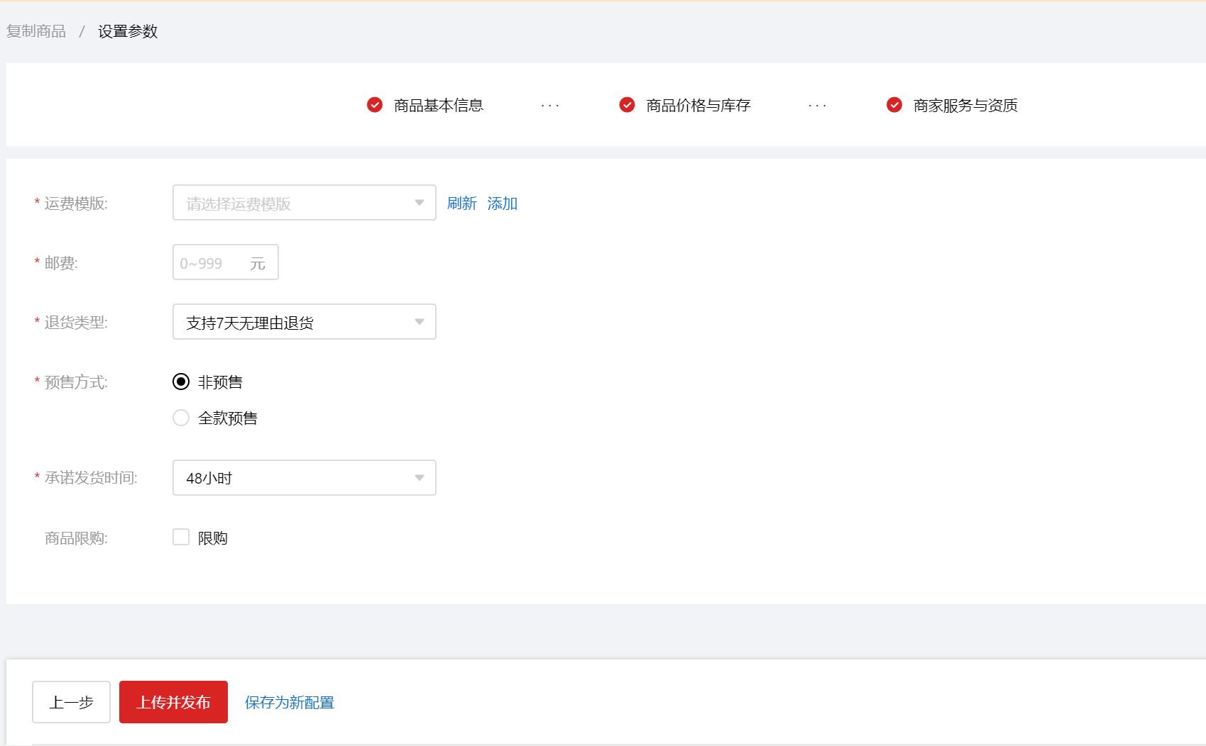 可以設置統一的運費模板、郵費價格、退貨方式、預售方式以及承諾發貨時間,設置完成后點上傳并發布即可。