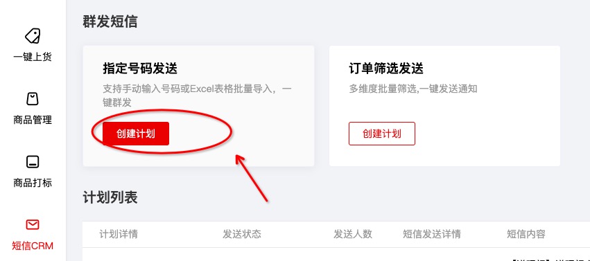步驟二:選擇指定號(hào)碼發(fā)送或是訂單篩選發(fā)送,并且創(chuàng)建計(jì)劃;